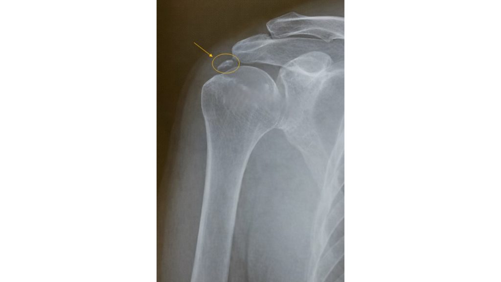 これは肩関節に石灰が沈着することによって炎症による痛みが出るのですが、臨床的には石灰が溜まっている