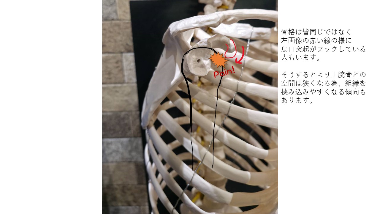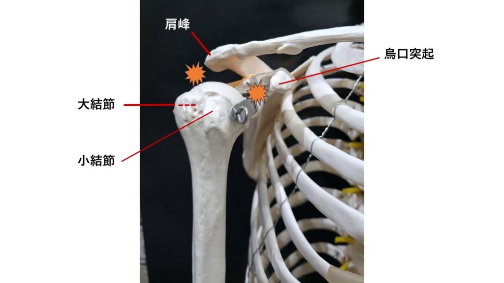特に挙上動作(腕を上げる動き)で痛みが出やすく、下図の烏口突起と小結節の間で挟まれてしまったり、肩峰と大結節の間で挟まれる事が多いです。